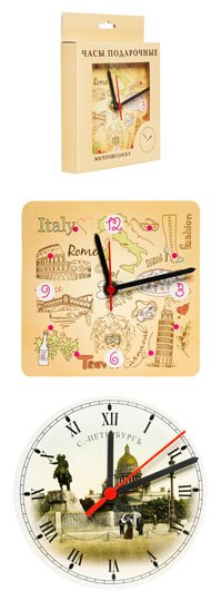 Заказав у нас сувенирные часы настенные, вы получаете множество преимуществ, а именно высокое качество продукции и возможность самостоятельно выбирать дизайн часов. Также вы покупаете часы у производителя, что существенно снижает их себестоимость. Вместе с часами предоставляется красивая упаковочная коробка, которая делает часы настенные идеальным подарком, который благодаря качеству и долговечности долгие годы будет напоминать человеку о подарившем их. Для оптовых покупателей существует система скидок, которая позволяет сэкономить при заказах больших партий товара. Кто предпочитает приобретать сувенирные часы? Если вы решили продавать сувенирные часы у себя в магазине, то можете быть уверенными, что их будут хорошо покупать. Благодаря возможности разного оформления, их можно менять в зависимости от интерьерных решений. Можно также сделать детскую коллекцию часов, а также коллекцию для подростков или студентов. Другой возможностью является использовать часы настенные как рекламную продукцию. Их можно дарить на презентациях и других подобных мероприятиях. Также их можно дарить лучшим рабочим вместе с премией, чтобы они тоже повышали узнаваемость фирмы. Можно использовать такие часы в офисах и других учреждениях, при этом, несмотря на низкую стоимость, они будут идеально гармонировать с дизайном помещения. Поэтому настенные сувенирные часы можно смело назвать одними из самых востребованных хронометров на рынке. Особенности конструкции часов. Данные часы настенные печатаются на основе плотного картона, что позволяет снизить их себестоимость. При этом в них используется кварцевый механизм плавного хода, который отличается качеством и долговечностью. Как элемент питания часы настенные, используют батарейки типа АА. Кроме того в комплект входит упаковочная коробка, которая придает часам вид настоящего подарка. Легкость часов позволяет использовать их на любой поверхности. Заказав сувенирные часы у нас, вы получите отличное качество за максимально короткое время.