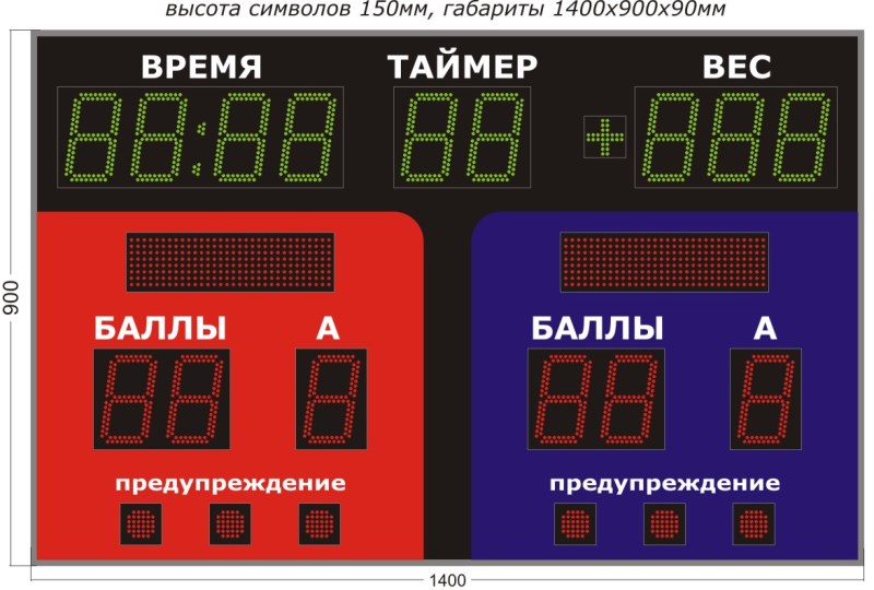 Табло для такой борьбы отображает как промежуточные, так и окончательные результаты поединка. Большинство моделей показывает следующее: хронометраж, общее время удержания, предупреждения и полученные баллы, а также личную информацию о борцах – их имена и весовые категории.